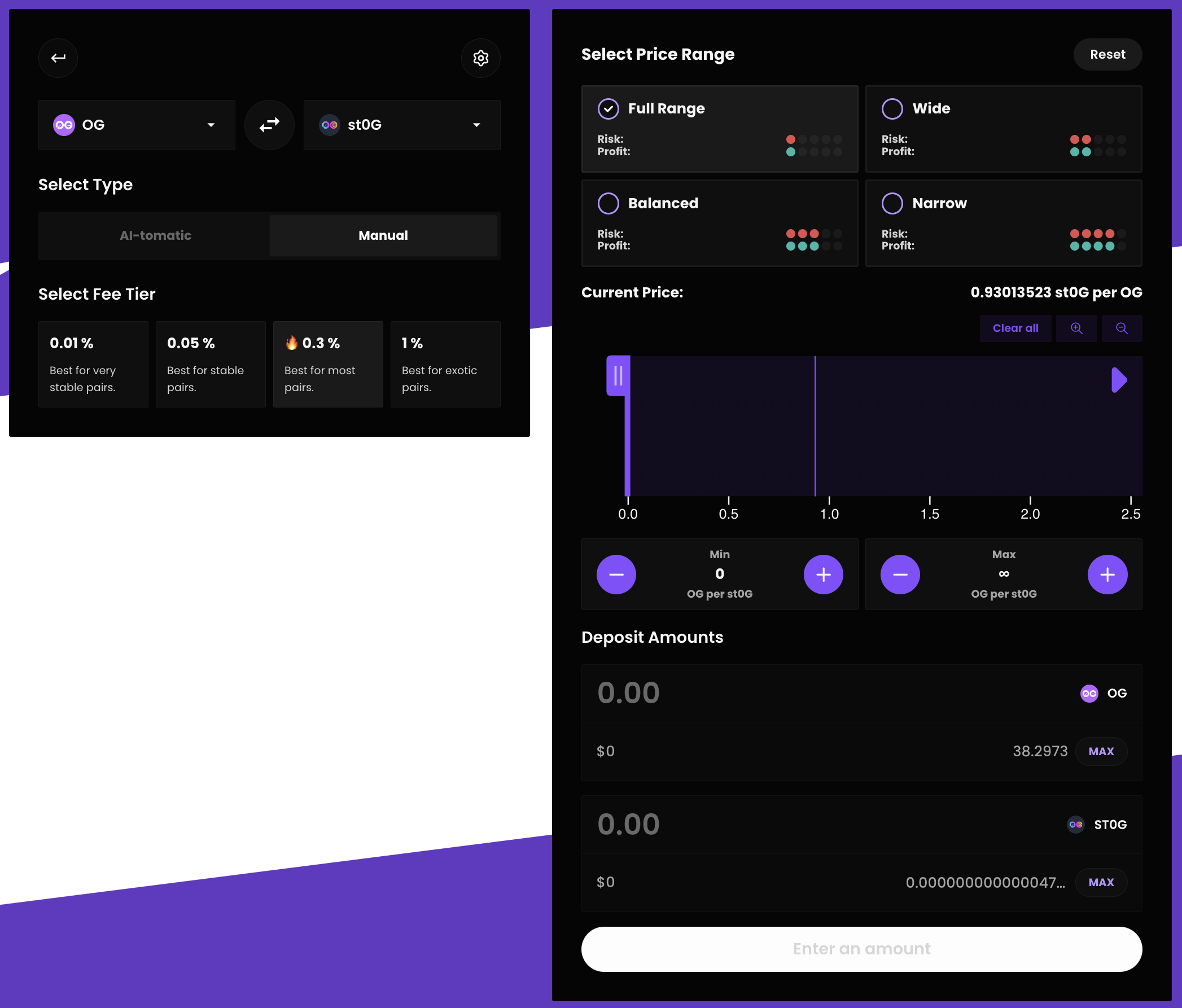 Next, on the right side, you’ll see price range and deposit amount. Easy part first: deposit amount is how many tokens you’ll provide. At this stage, you need to enter equal value on both sides (OG and stOG). My trick: click Max on one side—if the other side auto-fills and you have enough tokens, proceed; if not, try Max on the other side.