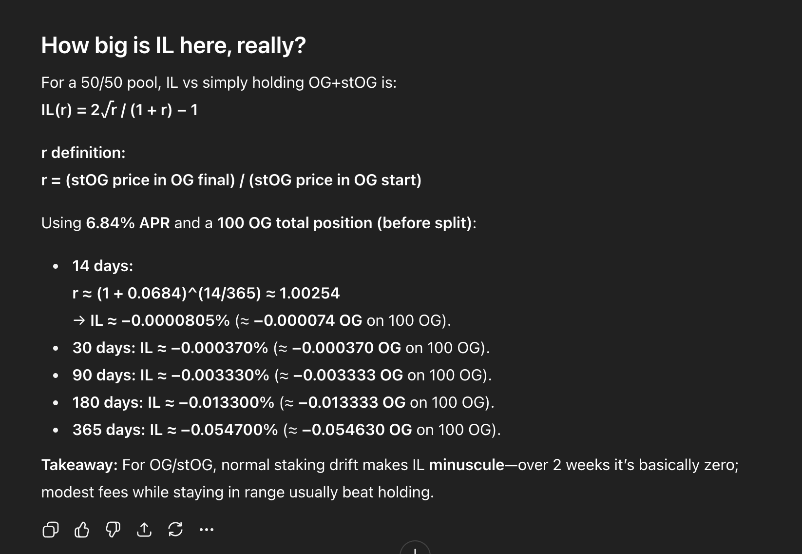How big is IL for OG/stOG? stOG earns yield (e.g., 6.84% APR), so it slowly appreciates vs OG. Over short periods the IL from this drift is tiny. For a 100 OG total position, it’s basically near zero (0.0000805 $OG) over 2 weeks, and still very small over a year. That’s why people LP this type of pair—the fees usually beat the tiny drift IL as long as you stay in range.