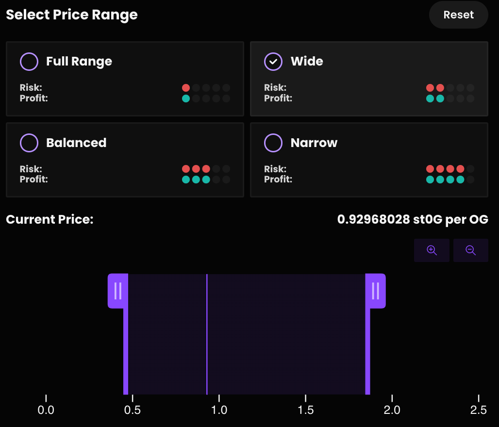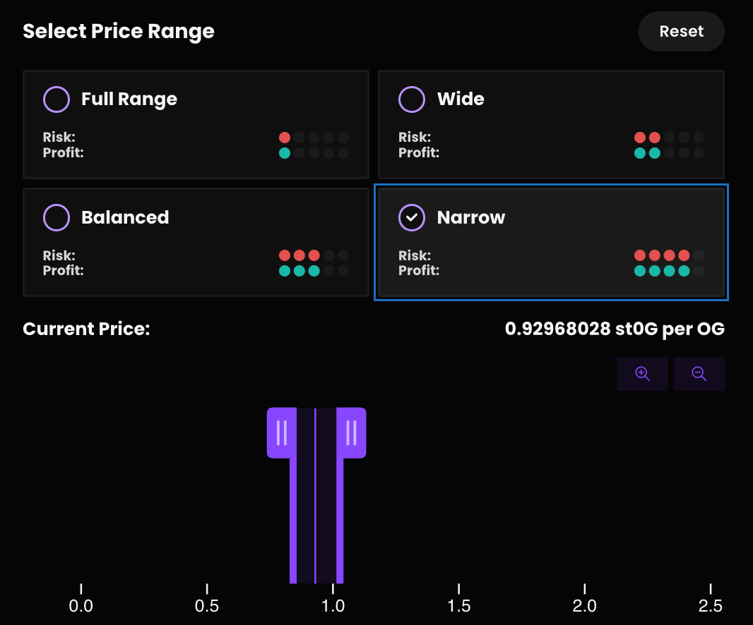 Then comes the price range—this is what you must monitor. If you don’t have time, choose a wider range (you’ll earn less in fees but stay active longer). There are four presets for range