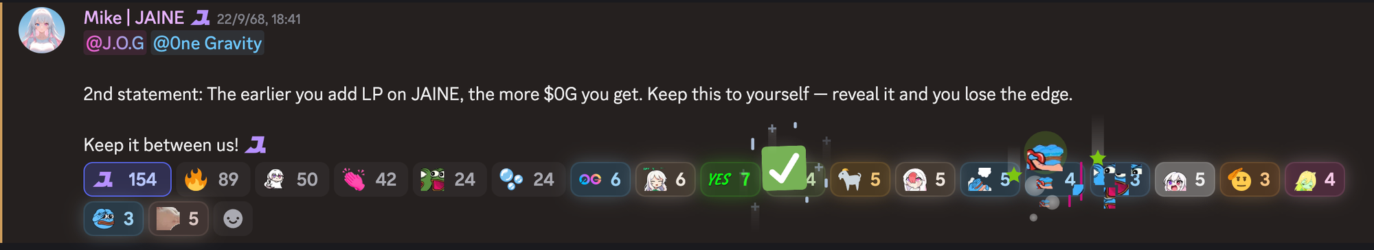 So I decided to stay active in the ecosystem. Jaine became the first project I explored deeper. I also hold OneGravity NFT, so I received a special role and saw the message in Jaine’s Discord that kicked this off.